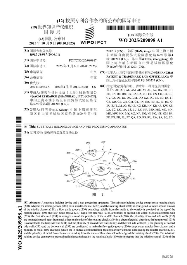盛美上海公布国际专利申请:“基板保持装置及湿法设备”