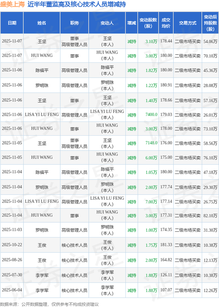 盛美上海近半年内的董监高及核心技术人员增减持详情如下: