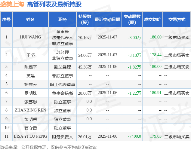 证券之星消息,根据11月10日市场公开信息、上市公司公告及交易所披露数据整理,盛美上海(688082)最新董监高及相关人员股份变动情况:2025年11月7日公司董事HUI WANG、董事,高级管理人员王坚共减持公司股份6.1万股,占公司总股本为0.0127%。变动期间公司股价下跌1.0%,11月7日当日收盘报177.2元。