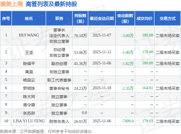 证券之星消息,根据11月20日市场公开信息、上市公司公告及交易所披露数据整理,盛美上海(688082)最新董监高及相关人员股份变动情况:2025年11月19日公司董事,高级管理人员王坚、高级管理人员陈福平共减持公司股份8.85万股,占公司总股本为0.0185%。变动期间公司股价下跌1.2%,11月19日当日收盘报161.65元。