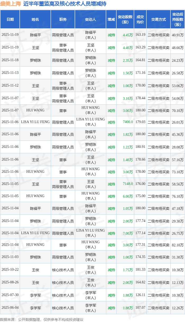 盛美上海近半年内的董监高及核心技术人员增减持详情如下: