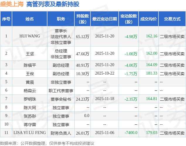 盛美上海的高管列表及最新持股情况如下: