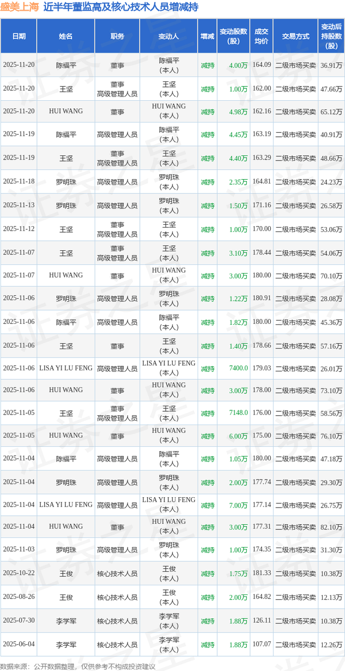 盛美上海近半年内的董监高及核心技术人员增减持详情如下: