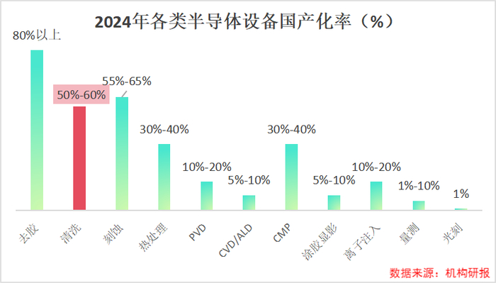 从当前我国半导体设备国产化率结构来看,2024年我国半导体清洗设备的国产化率已经达到60%左右,国内市场扩张有限。