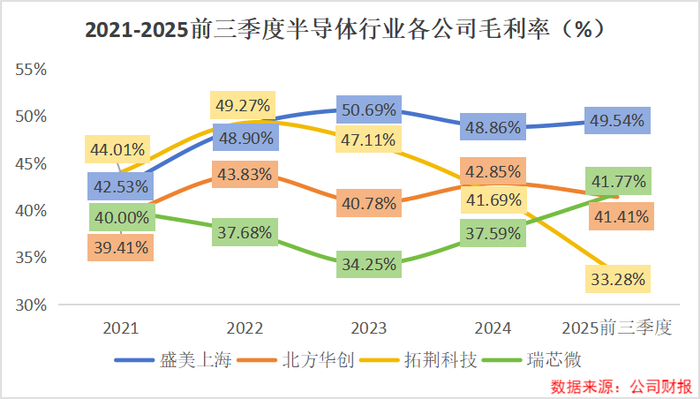 2021到2025年前三季度,盛美上海的毛利率从42.53%上升到49.54%,上升趋势明显。