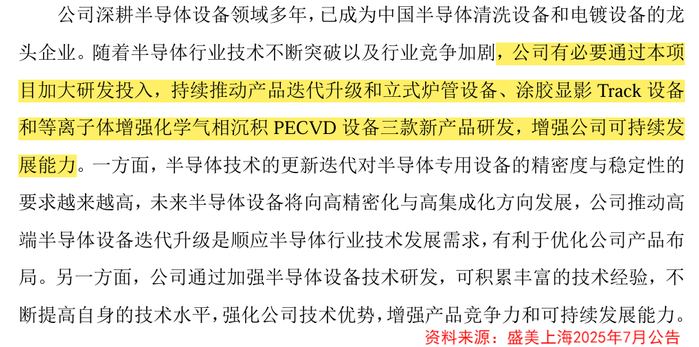 公司在募资说明书中表示将持续推动产品迭代升级和立式炉管设备、涂胶显影Track设备和等离子体增强化学气相沉积PECVD设备三款新产品研发。