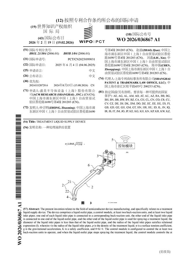证券之星消息,根据企查查数据显示盛美上海(688082)公布了一项国际专利申请,专利名为“一种处理液供给装置”,专利申请号为PCT/CN2025/099031,国际公布日为2026年2月19日。