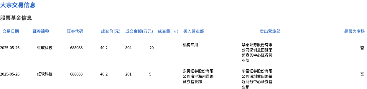 虹软科技今日大宗交易折价成交25万股,成交额1005万元