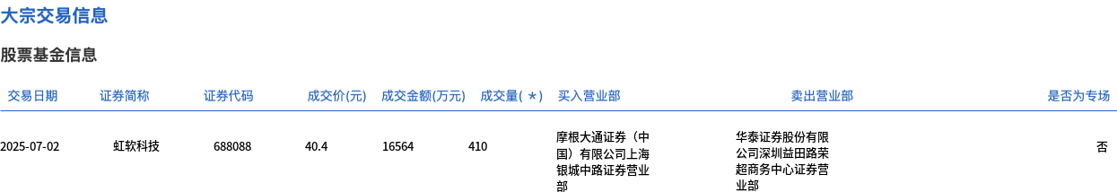 虹软科技今日大宗交易折价成交410万股,成交额1.66亿元