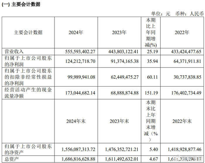 2024年,嘉必优实现营业收入5.56亿元,同比增长25.19%;归属于上市公司股东的净利润为1.24亿元,同比增长35.94%。