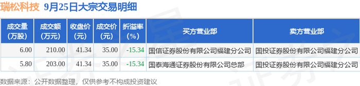 9月25日瑞松科技现2笔折价15.34%的大宗交易 合计成交413万元