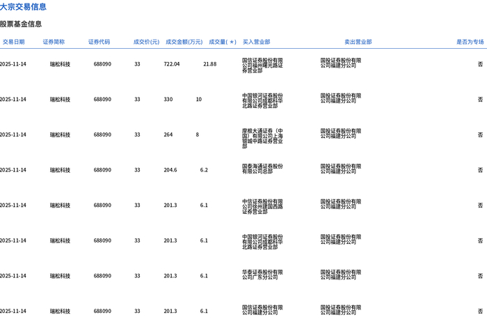 11月14日,瑞松科技大宗交易成交70.48万股,成交额2325.84万元,占当日总成交额的7.82%,成交价33元,较市场收盘价39.78元折价17.04%。