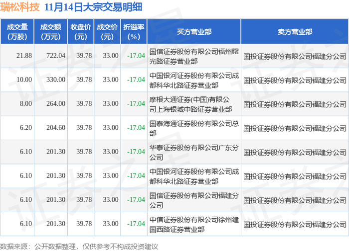 11月14日瑞松科技现8笔折价17.04%的大宗交易 合计成交2325.84万元