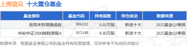 根据2025基金Q3季报公募基金重仓股数据,重仓该股的公募基金共2家,其中持有数量最多的公募基金为浙商基金的浙商丰利增强债券。浙商丰利增强债券目前规模为8.86亿元,最新净值1.8066(11月3日),较上一交易日上涨0.1%,近一年上涨12.64%。该公募基金现任基金经理为赵柳燕 黄玥 饶祖华。赵柳燕在任的基金产品包括:浙商日添利A,管理时间为2020年9月8日至今,期间收益率为8.78%;浙商日添金货币A,管理时间为2020年10月12日至今,期间收益率为9.89%;浙商中短债A,管理时间为2020年10月12日至今,期间收益率为16.98%;浙商惠隆39个月定开债券,管理时间为2020年10月12日至今,期间收益率为16.74%。饶祖华在任的基金产品包括:浙商中证500增强A,管理时间为2025年8月25日至今,期间收益率为6.4%;浙商智多盈债券A,管理时间为2025年8月25日至今,期间收益率为0.9%;浙商中证1000指数增强A,管理时间为2025年8月25日至今,期间收益率为2.88%。黄玥在任的基金产品包括:浙商智多盈债券A,管理时间为2024年12月16日至今,期间收益率为3.36%;浙商惠裕纯债A,管理时间为2025年2月27日至今,期间收益率为1.51%;浙商丰顺纯债债券,管理时间为2025年2月27日至今,期间收益率为1.29%;