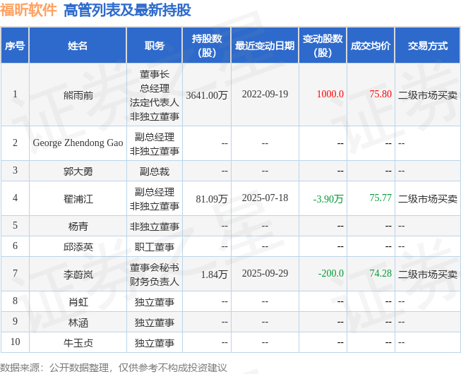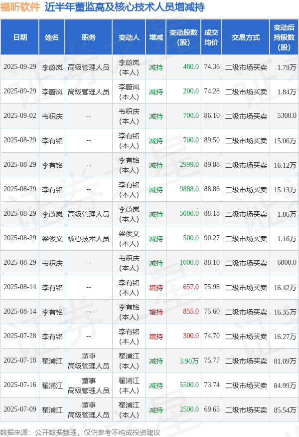 福昕软件近半年内的董监高及核心技术人员增减持详情如下: