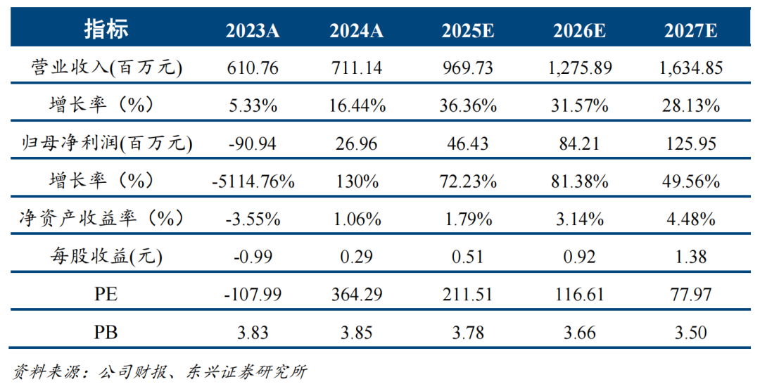 我们预计公司2025-2027年归母净利润分别为0.46、0.84、1.26亿元,当前股价对应PE值分别为212、117、78倍,维持“强烈推荐”评级。