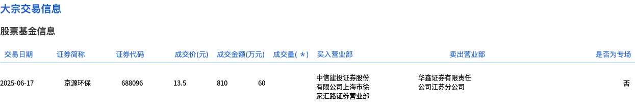 京源环保今日大宗交易折价成交60万股,成交额810万元