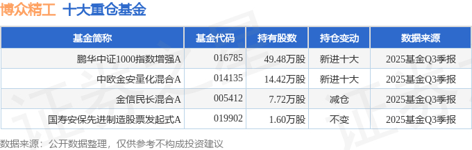 持有博众精工最多的基金为鹏华中证1000指数增强A,目前规模为10.95亿元,最新净值1.5468(10月31日),较上一交易日上涨0.12%,近一年上涨50.94%。该基金现任基金经理为苏俊杰 时赟超。