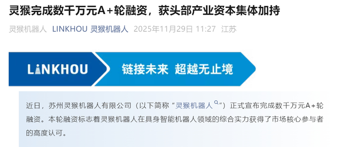 瑞财经 王敏12月1日,苏州灵猴机器人有限公司(以下简称“灵猴机器人”)官微正式宣布完成数千万元A+轮融资。