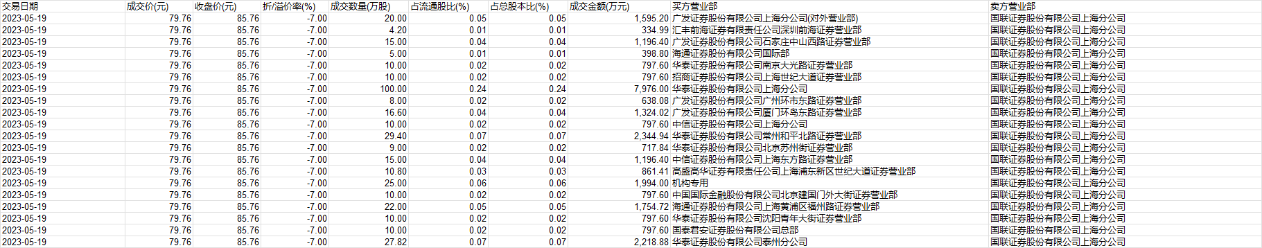 5月19日大宗交易成交367.82万股,成交额2.93亿元,占当日总成交额的28.44%,成交价79.76元,较市场收盘价85.76元折价7.0%。