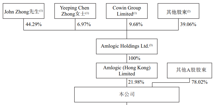 John Zhong先生、Yeeping Chen Zhong女士及控制Cowin GroupLimited的陈海涛先生为一致行动人,通过Amlogic Holdings合计持股约21.98%;其他A股股东合计持股约78.02%。