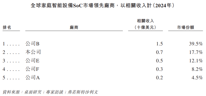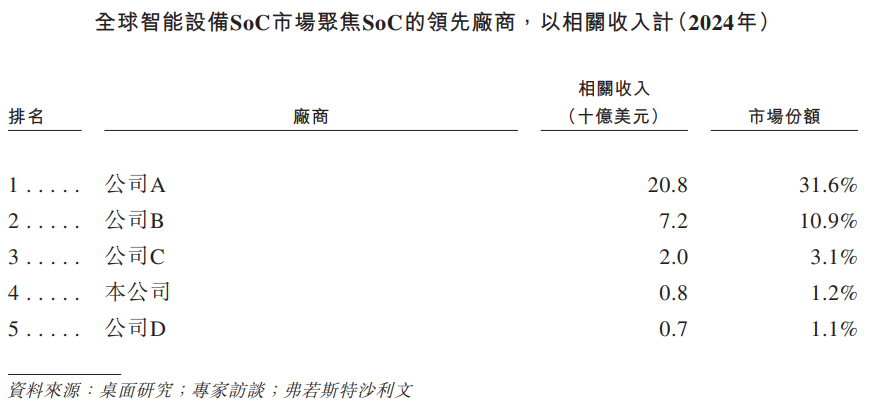 以2024年相关收入计,公司在全球所有专注于提供SoC的智能设备SoC厂商中排名第4,市场占有率为1.2%。按相关收入计(不包括智能个人移动设备收入),公司在全球所有专注于提供SoC的智能设备SoC提供商中排名第三。