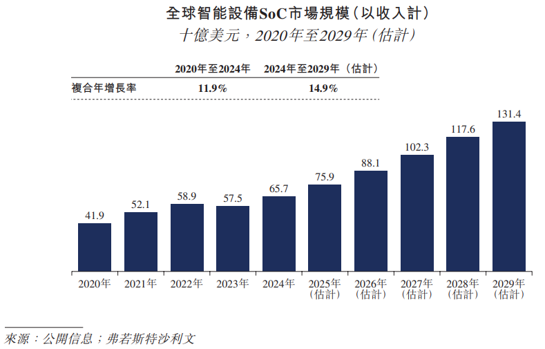 根据弗若斯特沙利文(Frost & Sullivan)报告,以收入计,全球智能设备SoC市场由2020年的419亿美元增长至2024年的657亿美元,2020年至2024年的复合年增长率达到11.9%。预计至2029年,全球智能设备SoC市场规模将进一步增长至1,314亿美元,2024年至2029年的复合年增长率达到14.9%。