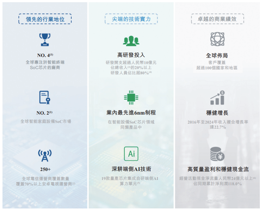 根据弗若斯特沙利文(Frost & Sullivan)报告,按2024年的相关收入计,公司在专注于智能终端SoC芯片的厂商中位列全球第四,在家庭智能终端SoC芯片领域位列中国大陆第一、全球第二。