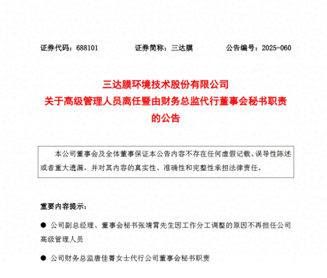 其中,三达膜原副总经理、董事会秘书张靖霄因工作分工调整,不再担任高级管理人员,转而出任公司纳滤技术应用与推广中心总经理及联席证券事务代表;公司财务总监唐佳菁将代行董事会秘书职责。