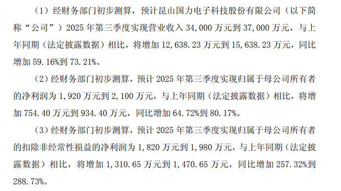 瑞财经 钟鸣辰 10月9日晚,国力电子(SH688103)发布2025年第三季度业绩预告,预计第三季净利润同比增加64.72%到80.17%。
