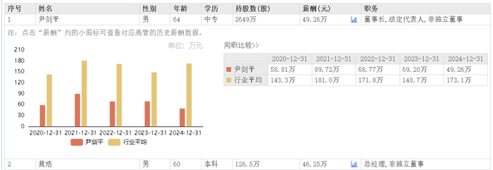 据东方财富网数据,国力股份董事长尹剑平2024年所获薪酬为49.26万元,总经理黄浩同年领薪46.25万元。