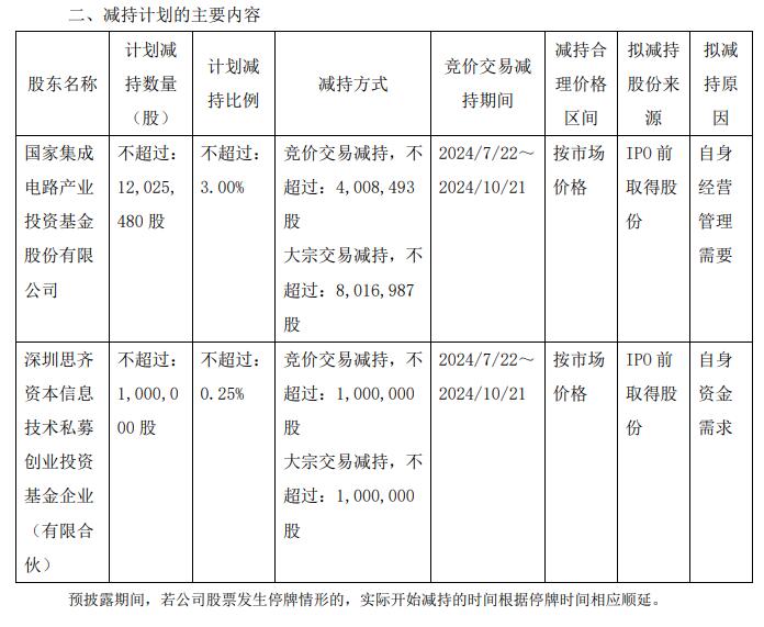 由于股东自身经营管理需要,产业基金将根据市场情况拟通过集中竞价或大宗交易的方式减持其所持有的公司股份数量合计不超过12,025,480股,拟减持股份数量占公司总股本的比例合计不超过3.00%,减持期间为公告披露之日起15个交易日后的3个月内。其中,在任意连续90个自然日内,通过集中竞价交易减持股份的总数不超过公司股份总数的1%;在任意连续90个自然日内,通过大宗交易减持股份的总数不超过公司股份总数的2%。