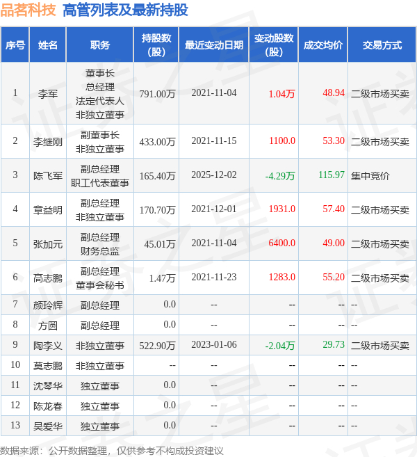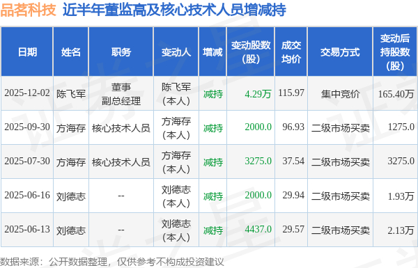 品茗科技近半年内的董监高及核心技术人员增减持详情如下:
