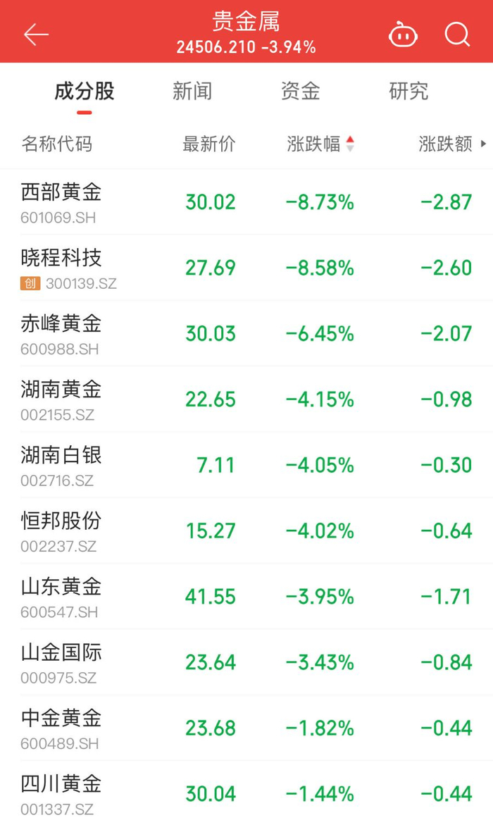 ¹ó½ðÊô´óÃæ»ý»Øµ÷£¬Î÷²¿»Æ½ð¡¢Ïþ³Ì¿Æ¼¼µø³¬8%£¬³à·å»Æ½ð¡¢Ê¢´ï×ÊÔ´µø5%£¬×Ͻð¿óÒµµø³¬3%¡£