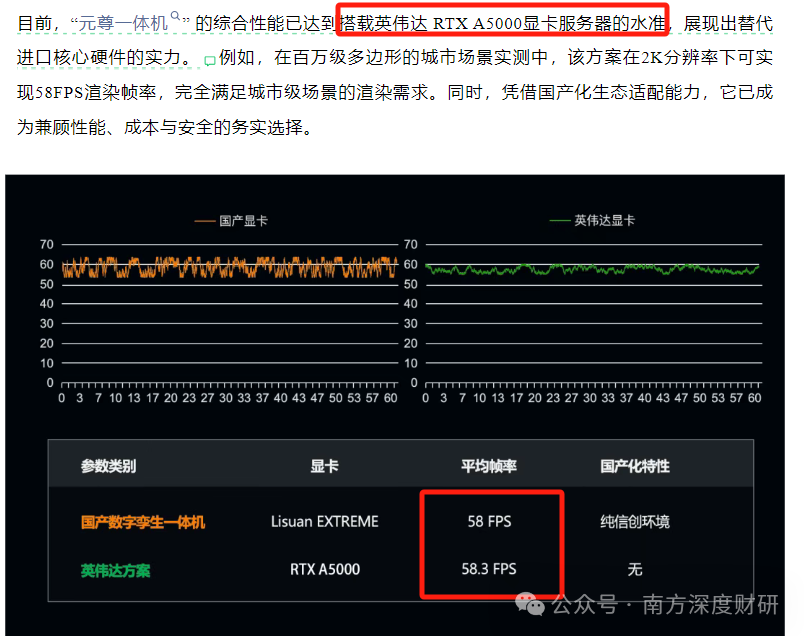 盘后,与砺算科技合作的飞渡科技更是在官方公众号肯定了与砺算科技联合打造的国内首款空间智能信创服务器——元尊一体机 的综合性能已达到搭载英伟达 RTX A5000显卡服务器的水准。