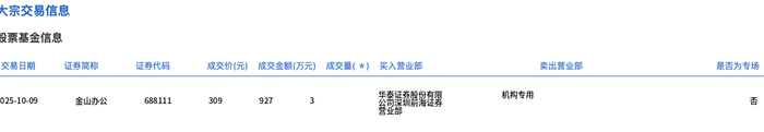 10月9日,金山办公大宗交易成交3万股,成交额927万元,占当日总成交额的0.21%,成交价309元,较市场收盘价318.93元折价3.11%。