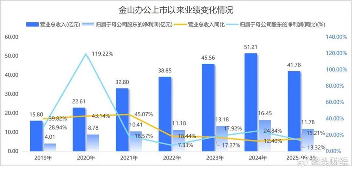 在多重利好刺激下,金山办公业绩整体呈现持续增长态势。营业收入从2019年的15.80亿元,增长至2024年的51.21亿元。2019年—2021年期间,公司营收年均复合增长率高达44.08%,净利润年均复合增长率更是达到61.12%。