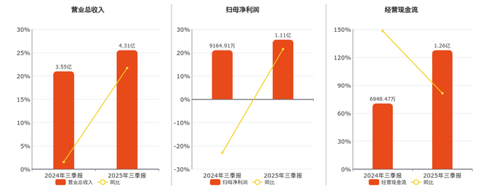 公司营业总收入为4.31亿元,在已披露的同业公司中排名第144。归母净利润为1.11亿元。经营活动现金净流入为1.26亿元。