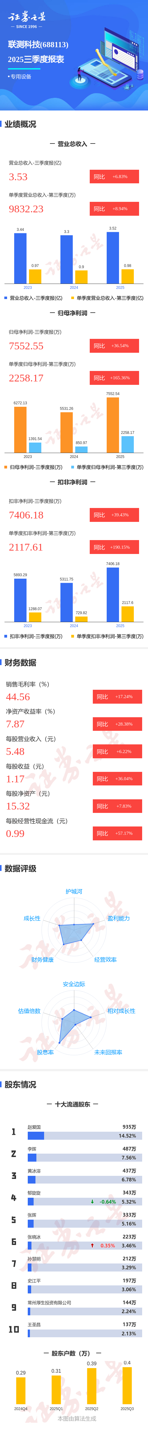 图解联测科技三季报:第三季度单季净利润同比增长165.36%