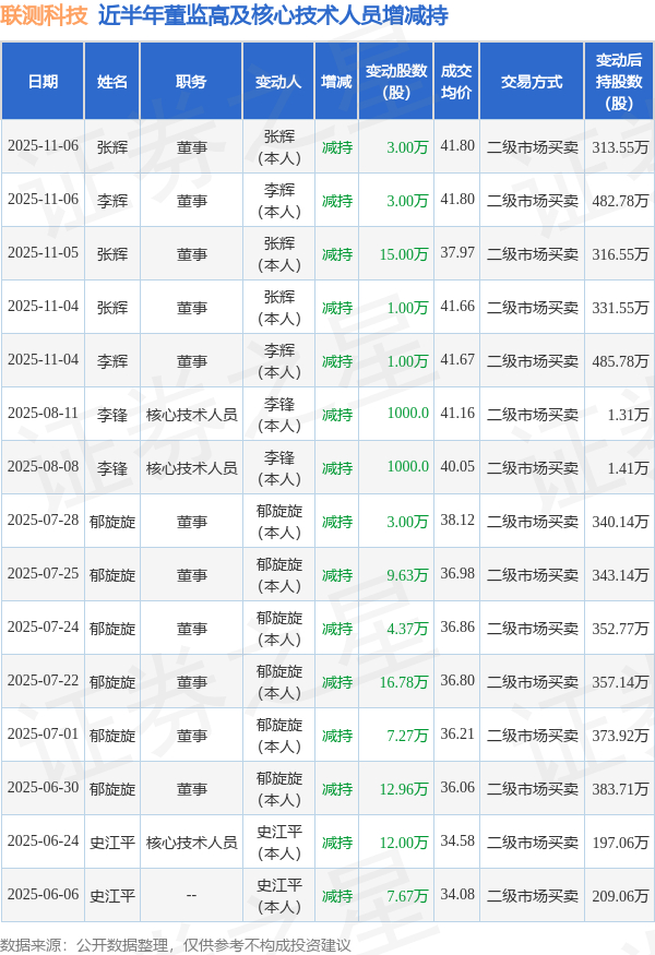 联测科技近半年内的董监高及核心技术人员增减持详情如下: