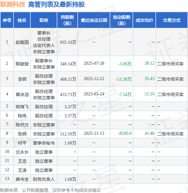 联测科技的高管列表及最新持股情况如下:
