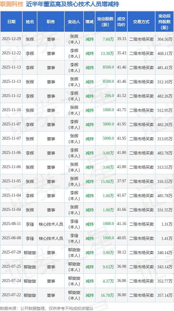 联测科技近半年内的董监高及核心技术人员增减持详情如下: