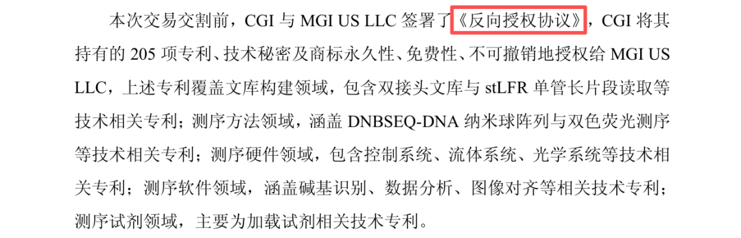 首先,在签署《股权购买协议》前,华大便已让CGI与华大在美的全资子公司MGI US LLC签署了《反向授权协议》,将其持有的205项专利、技术秘密及商标永久性、免费性、不可撤销地授权给MGI US LLC使用。