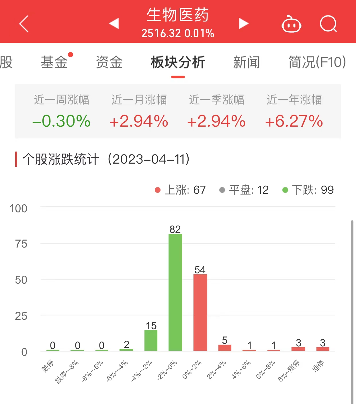 中国经济网北京4月11日讯今日,生物医药板块整体涨幅0.01%,其中67只股票上涨,12只股票平盘,99只股票下跌。