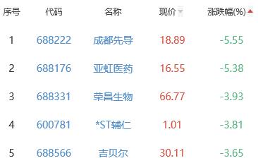 成都先导、亚虹医药、荣昌生物、*ST辅仁、吉贝尔位列涨幅榜后五位,涨幅分别为-5.55%、-5.38%、-3.93%、-3.81%、-3.65%。