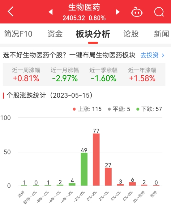 中国经济网北京5月15日讯今日,生物医药板块整体涨幅0.80%,其中115只股票上涨,5只股票平盘,57只股票下跌。
