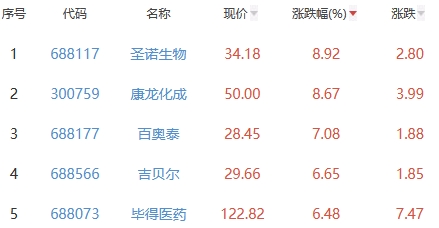 其中,圣诺生物、康龙化成、百奥泰、吉贝尔、毕得医药位列板块涨幅前五位,涨幅分别为8.92%、8.67%、7.08%、6.65%、6.48%。