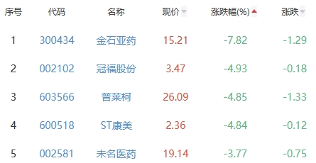 金石亚药、冠福股份、普莱柯、ST康美、未名医药位列涨幅榜后五位,涨幅分别为-7.82%、-4.93%、-4.85%、-4.84%、-3.77%。