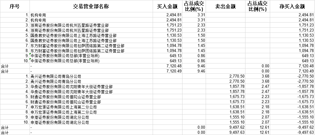具体来看,机构合计净买入2494.81万元。此外,知名游资现身龙虎榜,甬兴证券有限公司青岛分公司、华泰证券沈阳青年大街证券营业部分别卖出2770.50万元、1857.78万元;浙商证券杭州五星路证券营业部、章盟主(国泰君安证券上海江苏路证券营业部)分别买入1751.23万元、1130.53万元。