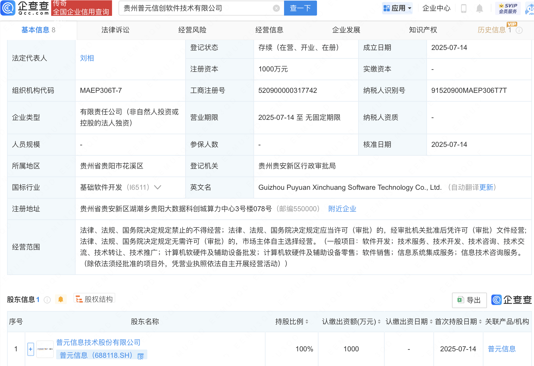 企查查APP显示,近日,贵州普元信创软件技术有限公司成立,注册资本1000万元,经营范围包含:计算机软硬件及辅助设备零售;软件销售;信息系统集成服务等。企查查股权穿透显示,该公司由普元信息(688118)全资持股。